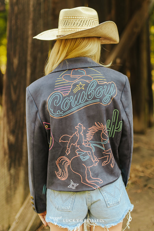 Grey Suede Button Down Printed Yeehaw Western Jacket