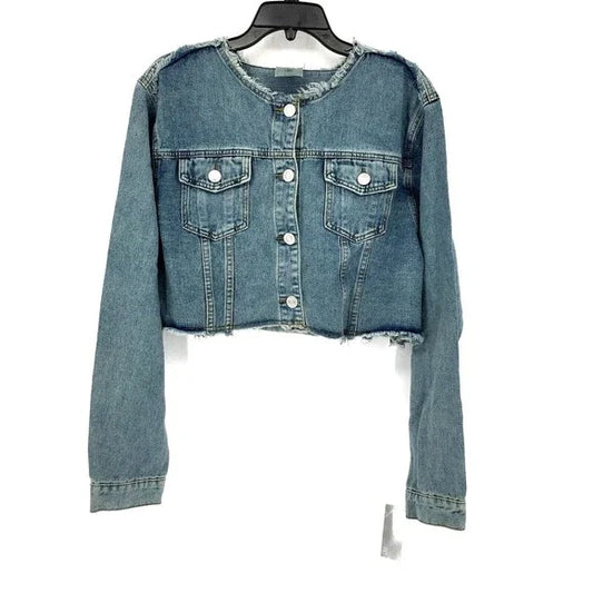 VOCAL RAW EDGE CUT NECK DENIM CROP JACKET WITH STONE FRINGES