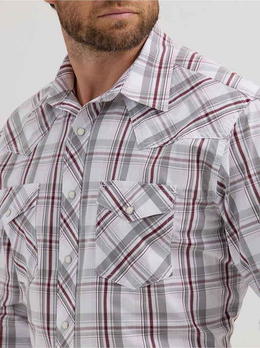 Wrangler 20X Competition Advanced Comfort Grey Plum Plaid Long Sleeve Snap Shirt