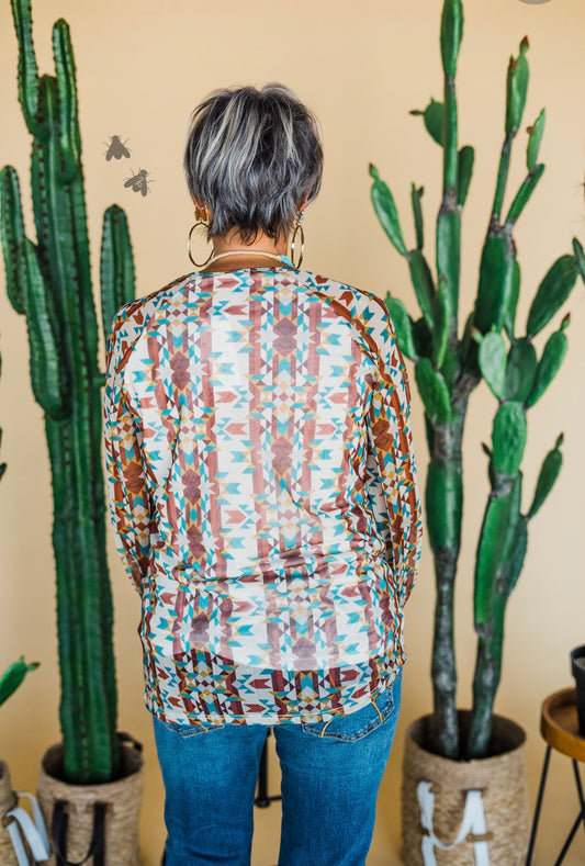 Cruel Girl Ladies Blue Geo Print Long Sleeve Shirt