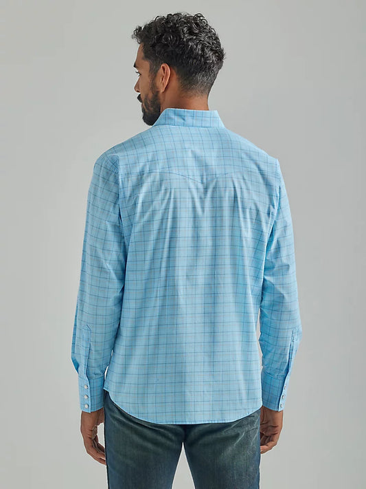 WRANGLER MEN'S WRINKLE RESIST LONG SLEEVE WESTERN SNAP PLAID SHIRT IN BABY BLUE