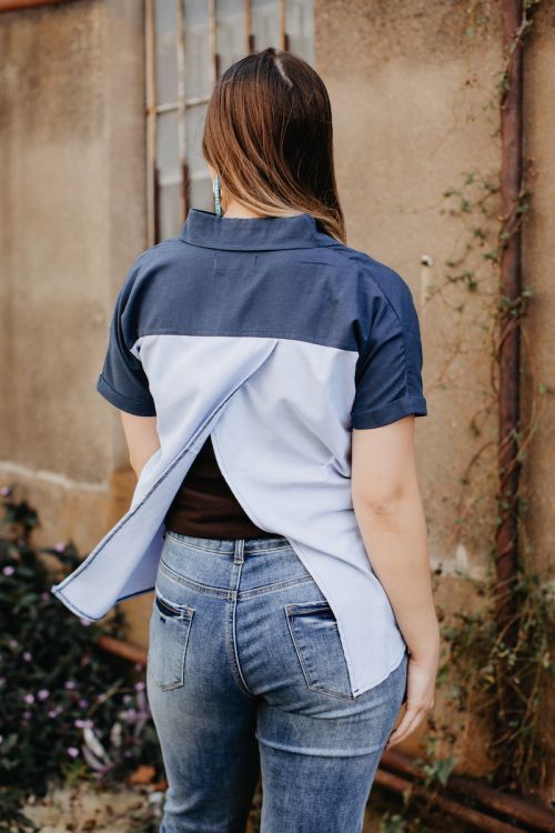 NAVY SHORT SLEEVE BUTTON UP TOP WITH BLUE SPLIT BACK