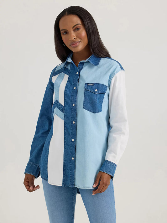 Wrangler Pieced Boyfriend Denim Western Snap Shirt
