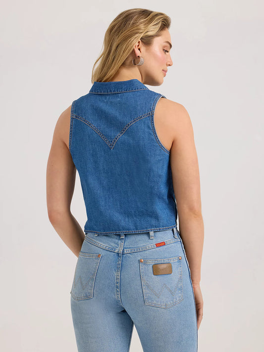 Wrangler Mid Wash Denim Sleeveless Tie Front Shirt
