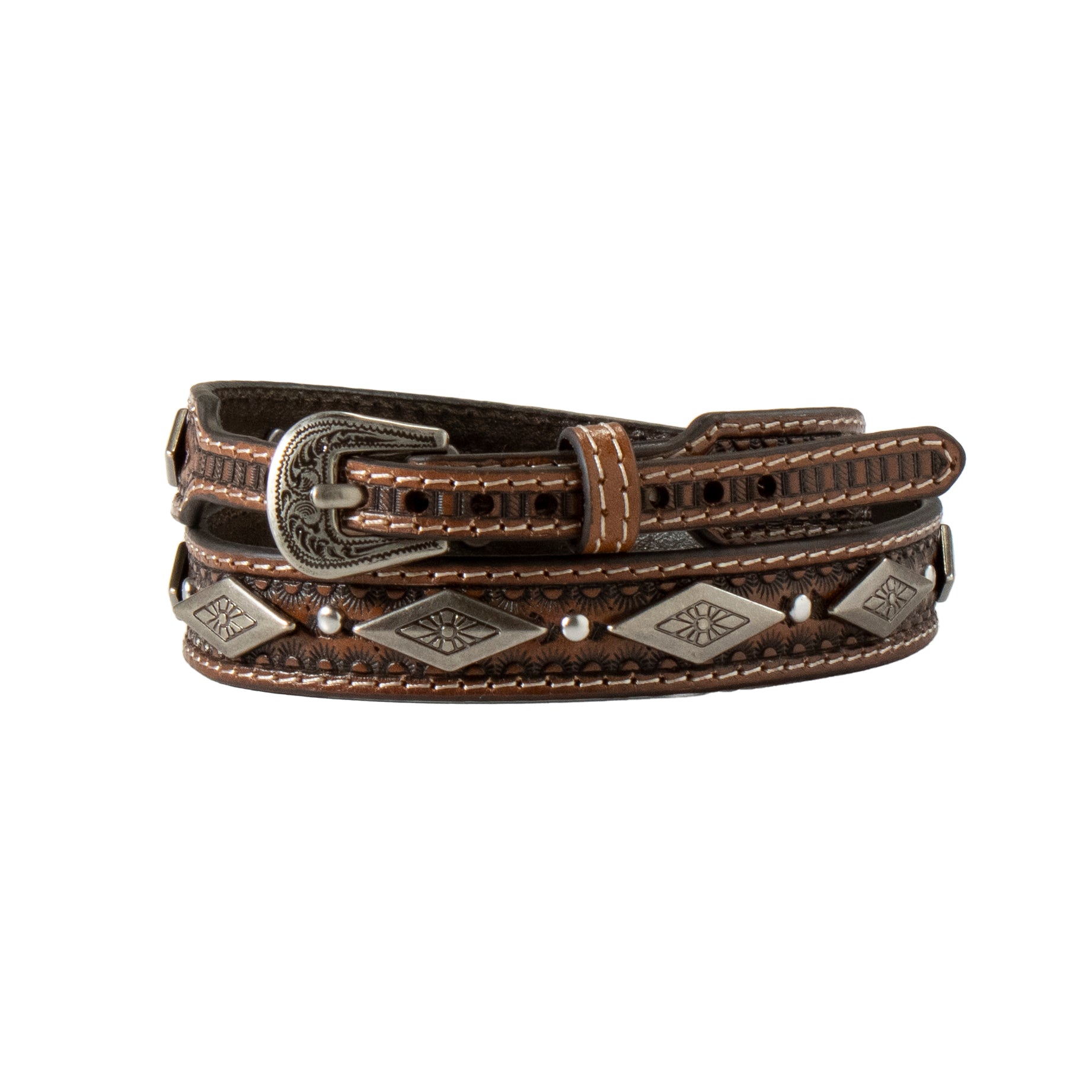 The body of the hatband is tooled with a floral design that is beautifully accented with triangular conchos and studs in between. Buckle closure.