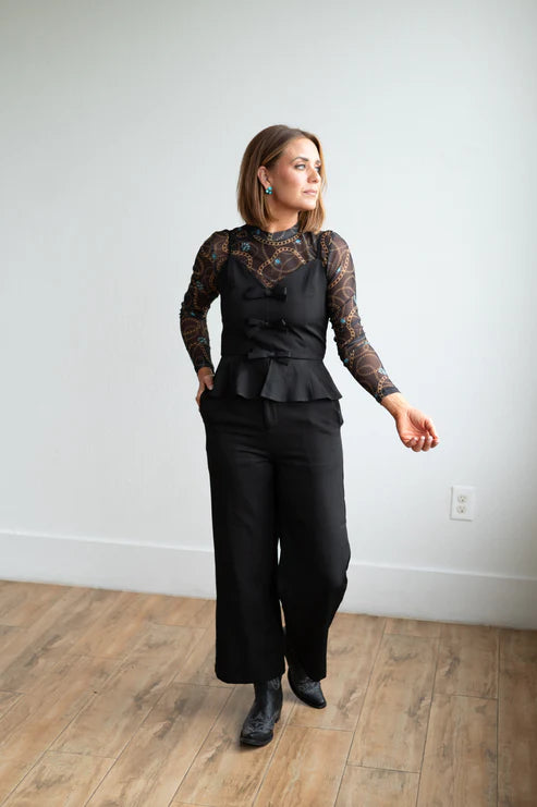 This 2-piece set is crafted from breathable, eco-friendly hemp fabric and includes a fitted sleeveless top paired with wide-leg pants. The top features a V-neckline, thin adjustable spaghetti straps, and three decorative fabric bows down the front. A subtle peplum hem adds a tailored finish. The coordinating pants have a relaxed, wide-leg cut with functional side pockets.