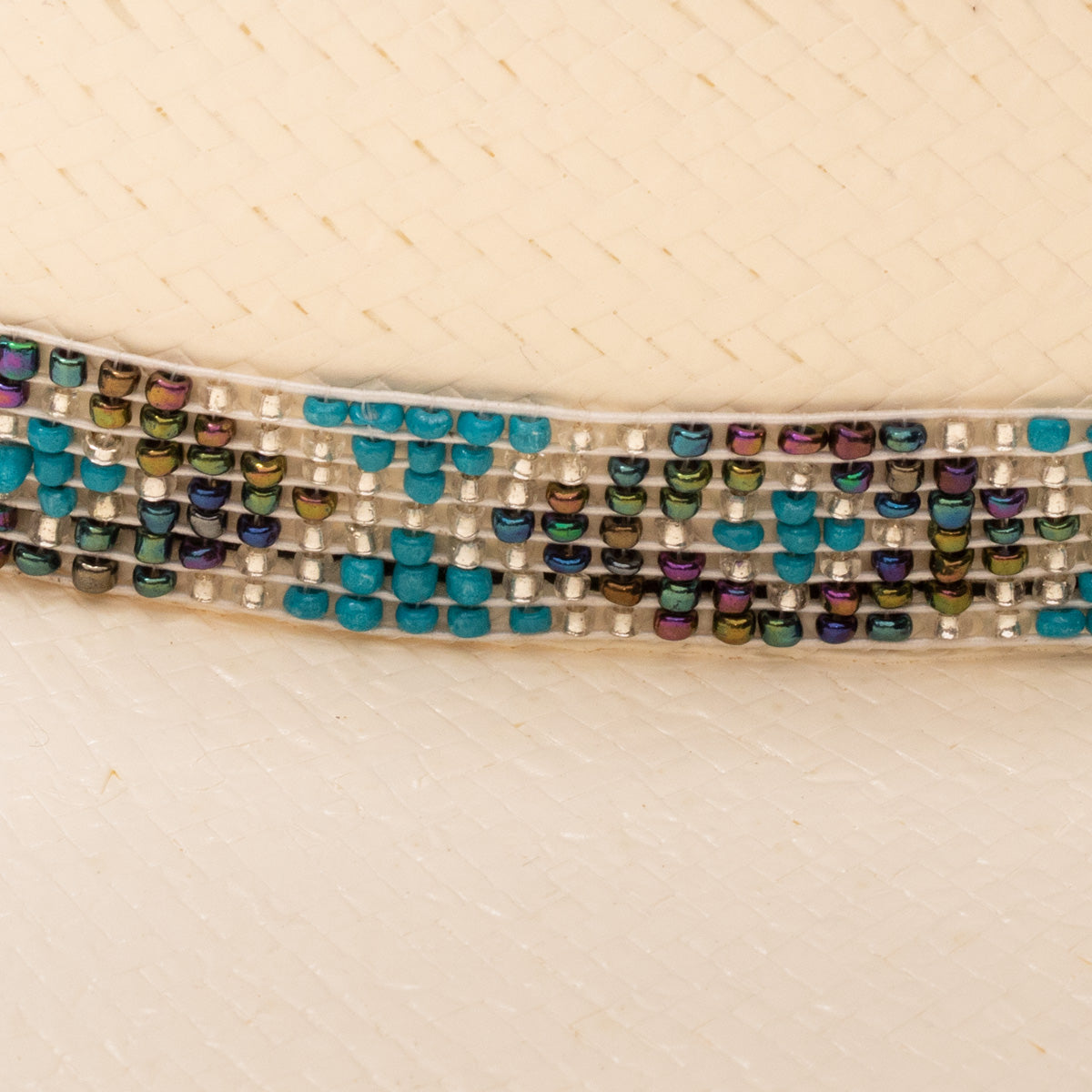 Ya’atah! Part of the Charlie 1 Horse Youth Collection, the Apache Jr. Hat is as much of a free spirit as she is. This shantung straw hat comes in a 4 1/8” cattleman’s crown with a 4” brim. The beaded hatband features a crisp, energizing diamondback pattern. Bright blue whip stitching adds charm and contrast to the brim. Classic vent patterning and a rusty, off-center Charlie 1 Horse brand logo complete the look. A stretchable elastic sweatband helps to ensure that she won’t outgrow it before summer’s end.