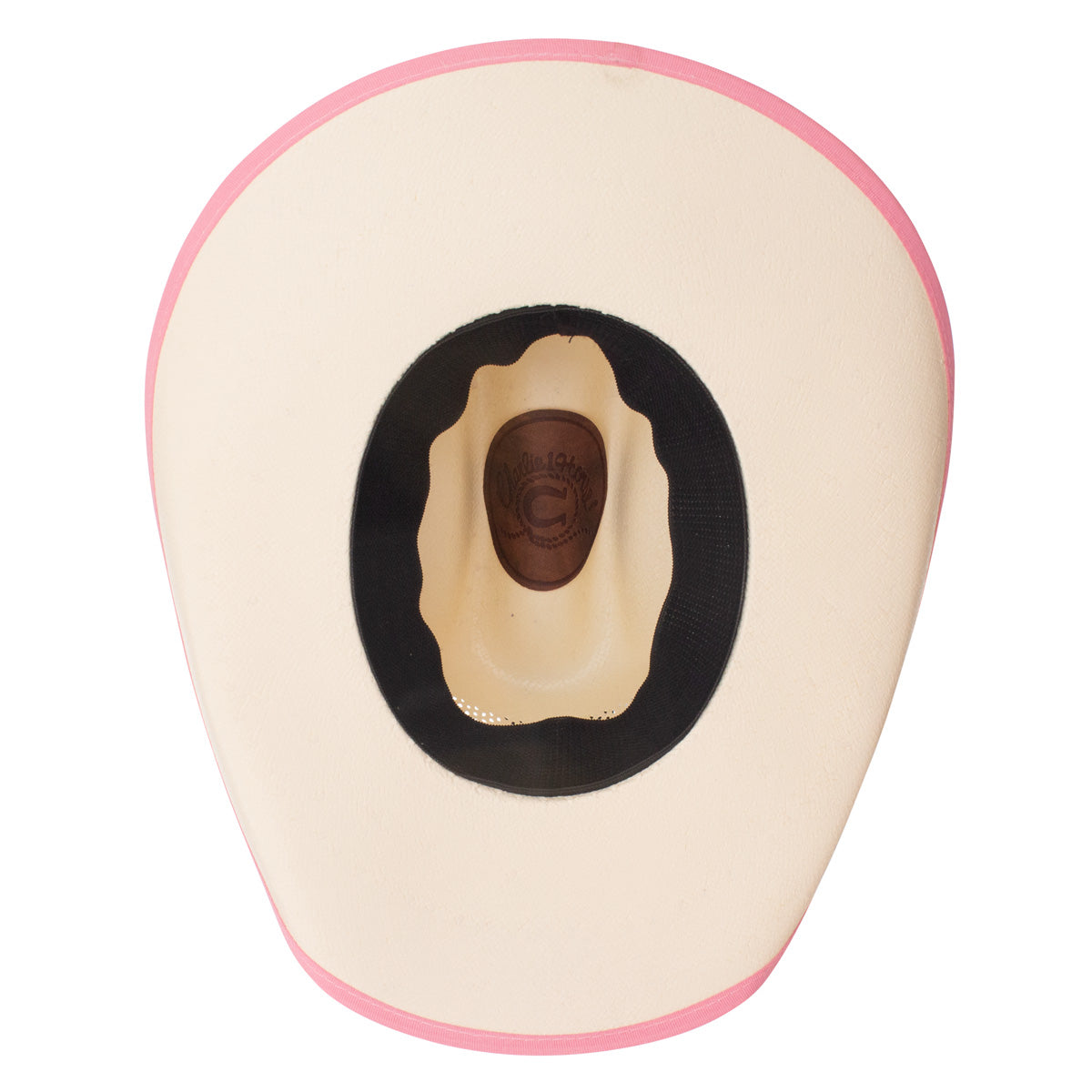 Made of shantung straw and cute as can be, the Gracie Jr. Hat is the bee’s knees. Part of our Charlie 1 Horse Youth Collection, this hat comes in a 4 1/8” cattleman’s crown with a 4” brim. The hatband features a beaded Southwestern pattern in white, deep rose, and pale blue, the ideal color complement for the girlish pink on the brim. The crown bears the Charlie 1 Horse logo, the sweatband is made of elastic to accommodate size changes. The Gracie Jr. is every young cowgirl’s dream.