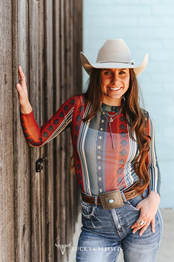 Red Blue Aztec Printed Long Sleeve Mesh Top