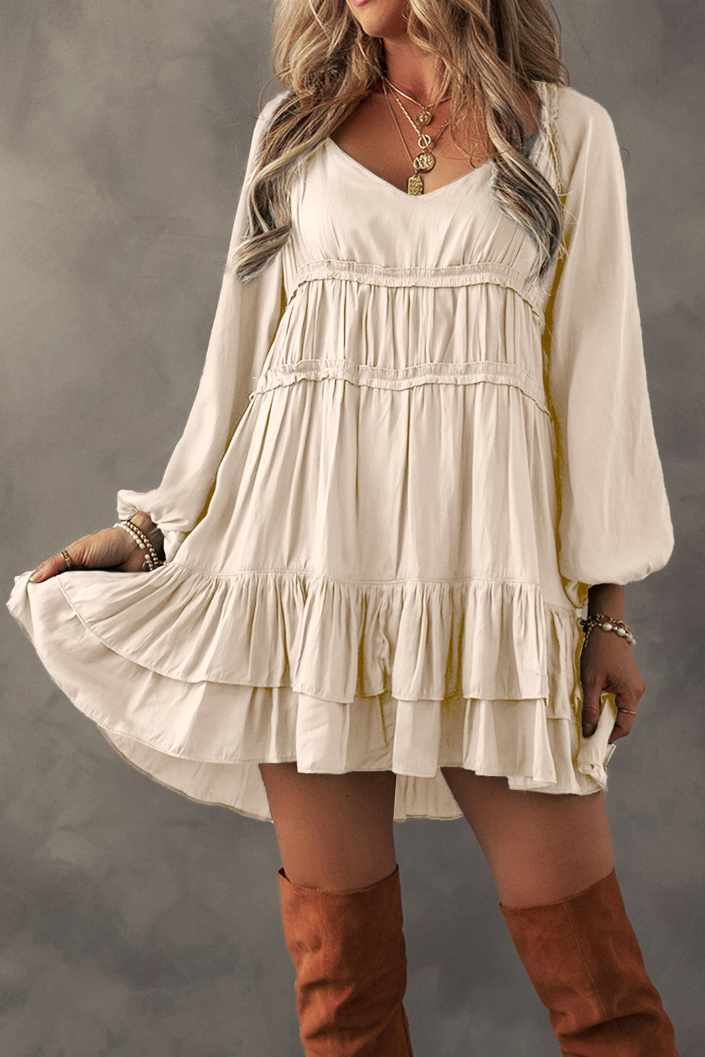 Tiered Ruffled Puff Sleeve Apricot Loose Fit Mini Dress
