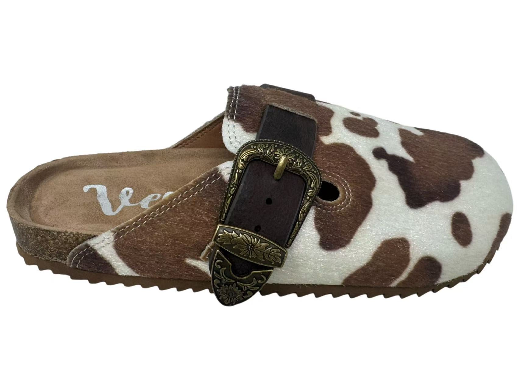Bring a touch of western charm to your everyday outfit. Featuring a brown and white cowhide print, a bold antique brass buckle, and a comfy contoured footbed, these slip-on's are perfect for adding personality to casual looks.