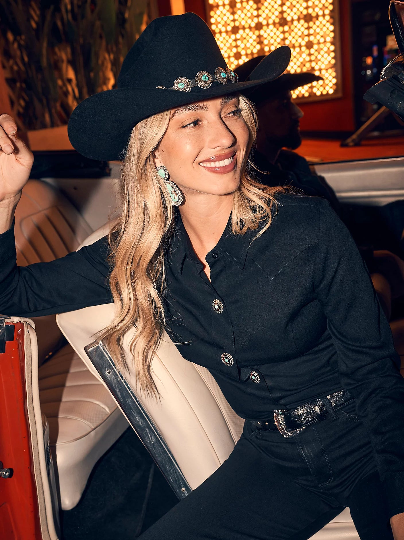 Who needs all those bells and whistles when you can have the most iconic statement piece? We’re talking conchos, and our Women’s Slim Concho Button Shirt does all the accessorizing for you. It’s crafted from a soft and silky fabric you’ll love wearing all year long. This iconic collared shirt comes with single-point yokes from front to back, a slimmed-down silhouette, and shiny concho buttons with turquoise-colored stone inserts. Tucked or untucked, this shirt will elevate every outfit.